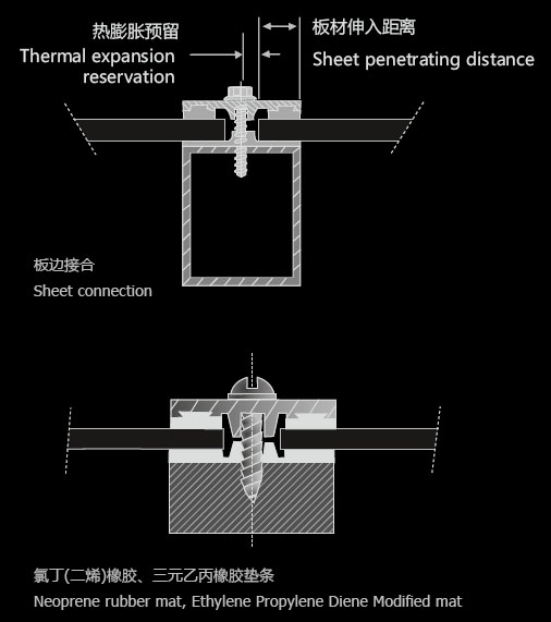 "干法"安裝的優(yōu)點是橡膠墊卡住板材,在熱脹和冷縮時板可以自由移動。